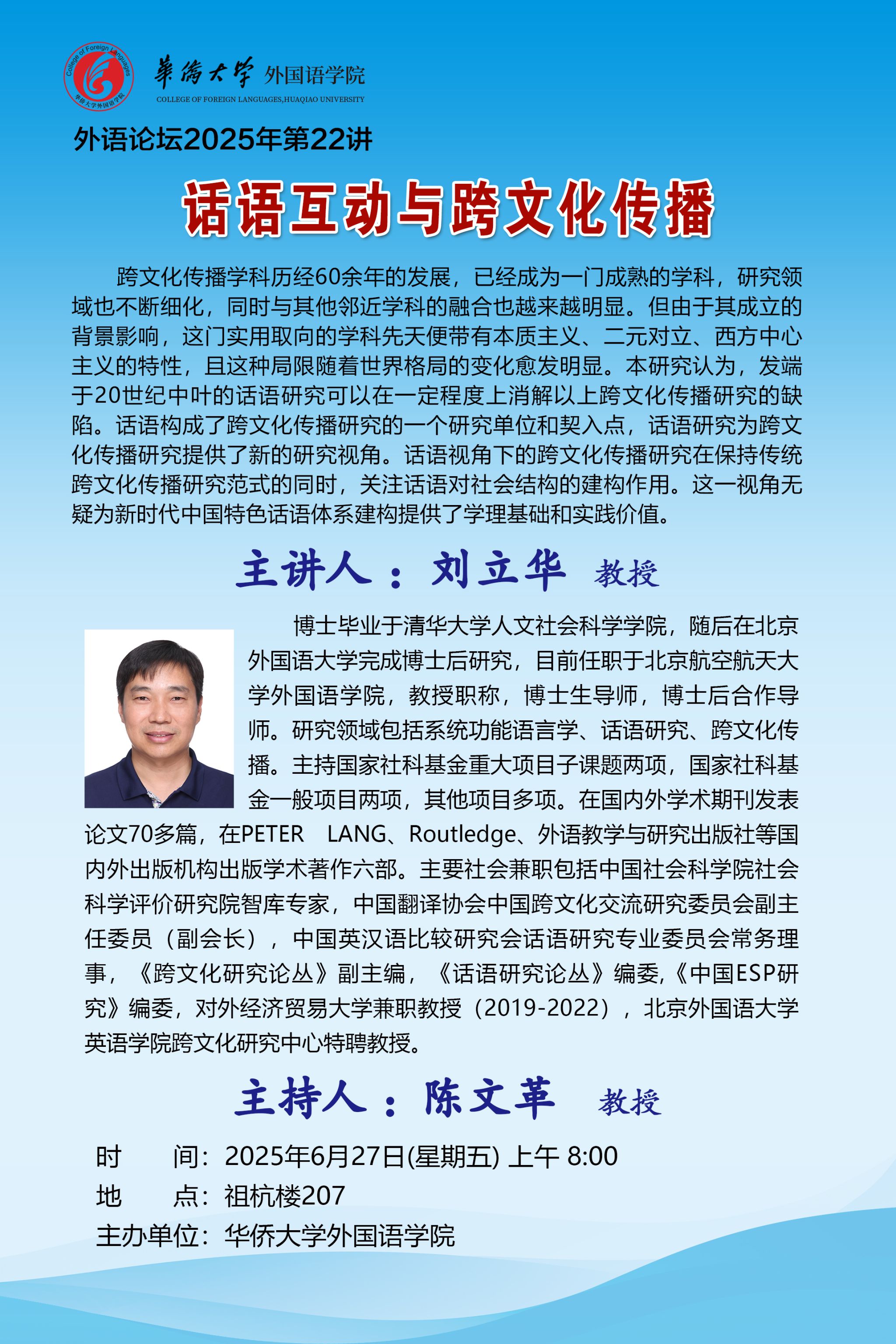 2025-07-112025年6月27日上午,北京航空航天大学刘立华教授应邀为公司做题为“话语互动与跨文化传播”的学术讲座。本次讲座由云顶国际8588yd陈文革教授主持,公司师生通过线上线下积极参与,现场气氛热烈,互动频繁。讲座伊始,刘立华教授首先介绍了话语分析的任务,揭示了话语与社会的辩证实现关系。基于Fairclough的三维分析框架,刘教授以“故事的力量”为切入点,阐述了话语中叙述者和叙事中主体之间的关系。刘教授指出,话语分析是解读跨文化传播中语言符号权力结构的途径,...