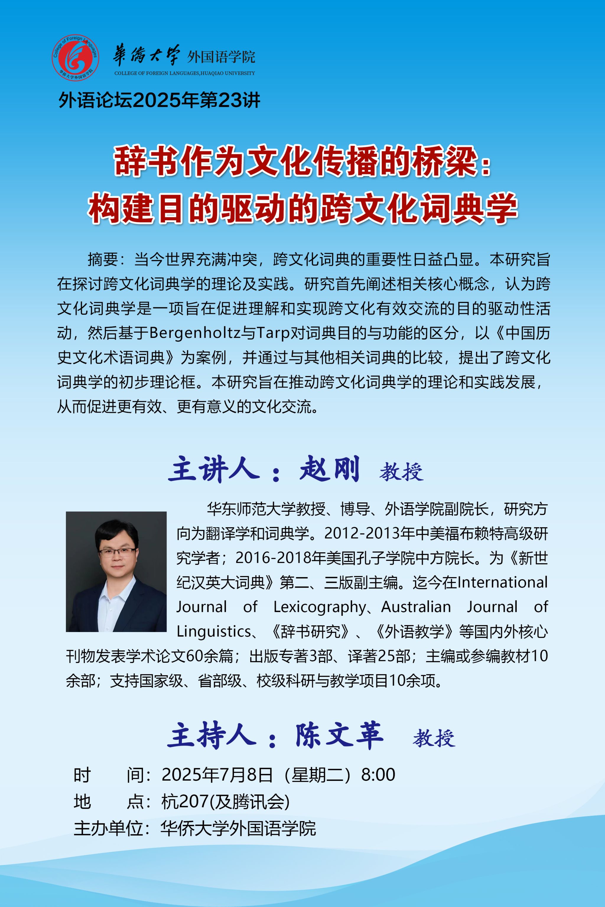 2025-07-142025年7月8日上午,外语论坛2025年第23讲成功举办。云顶国际8588yd赵刚教授应邀开展题为“辞书作为文化传播的桥梁:构建目的驱动的跨文化词典学”的精彩学术讲座。本次讲座采用线上和线下结合形式,由陈文革教授主持,陈教授开场中简要介绍了赵教授的研究方向、代表性著作与学术贡献,特别强调其在推动中国文化“走出去”进程中的引领作用。首先,赵教授指出自媒体时代,“权威”词典在传播中国文化方面具有独特优势,并表达了自己通过词典讲述中国文化故事的热忱。...