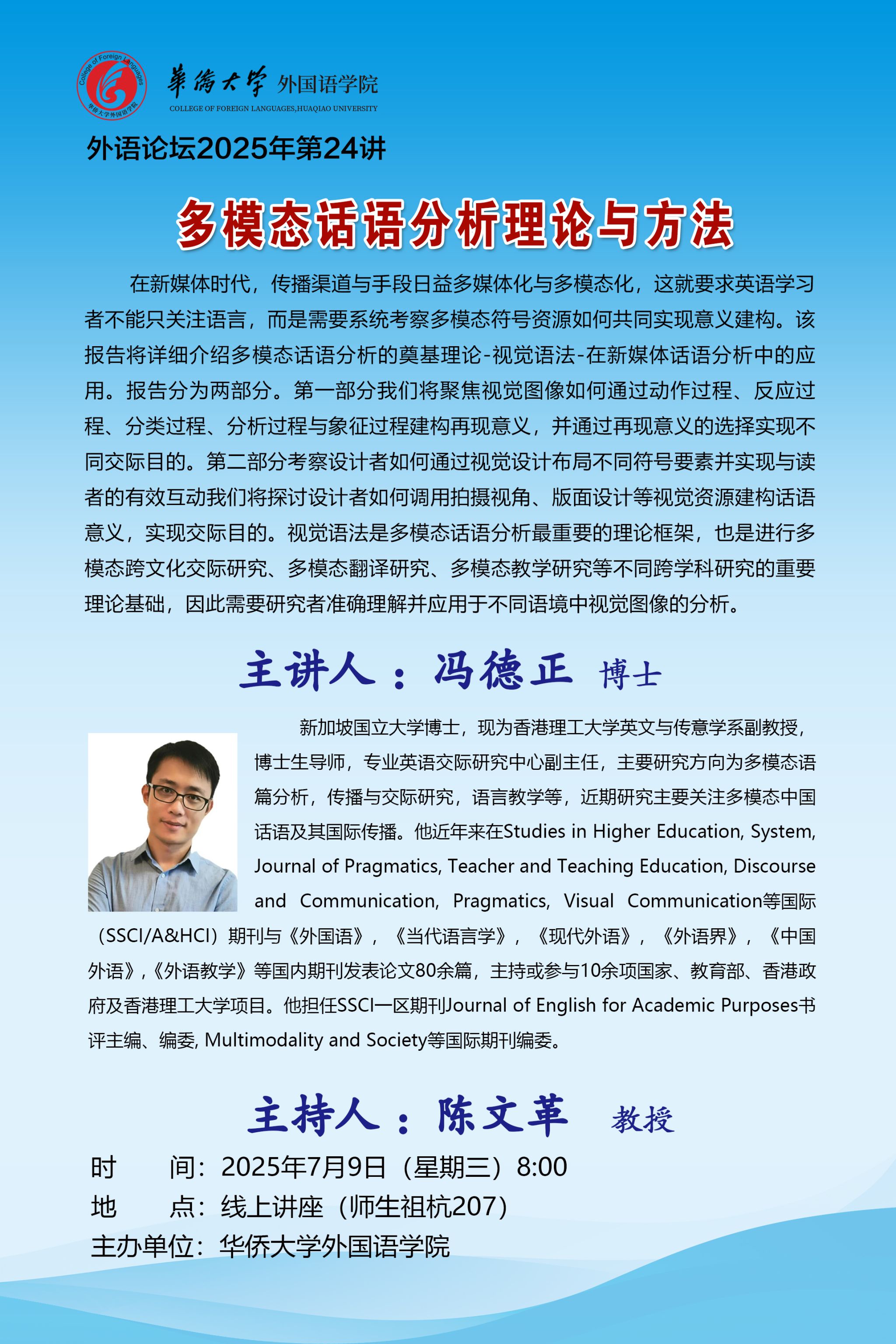 2025-09-292025年7月9日,云顶国际8588yd外语论坛第24讲在祖杭楼207教室成功举办。香港理工大学冯德正博士应邀开展题为“多模态话语分析的理论与方法”的学术讲座,讲座由云顶国际8588yd陈文革教授主持。讲座线下线上同时举行。冯德正博士围绕多模态话语分析的理论基础与实践方法展开深入讲解。他在讲座中指出,由于外语教学从通用语言教学逐步转向专业英语教学,视觉图像在传播实践中的作用日益凸显,培养批判性视觉素养成为必然。冯博士以香港理工大学官网图像为例,...