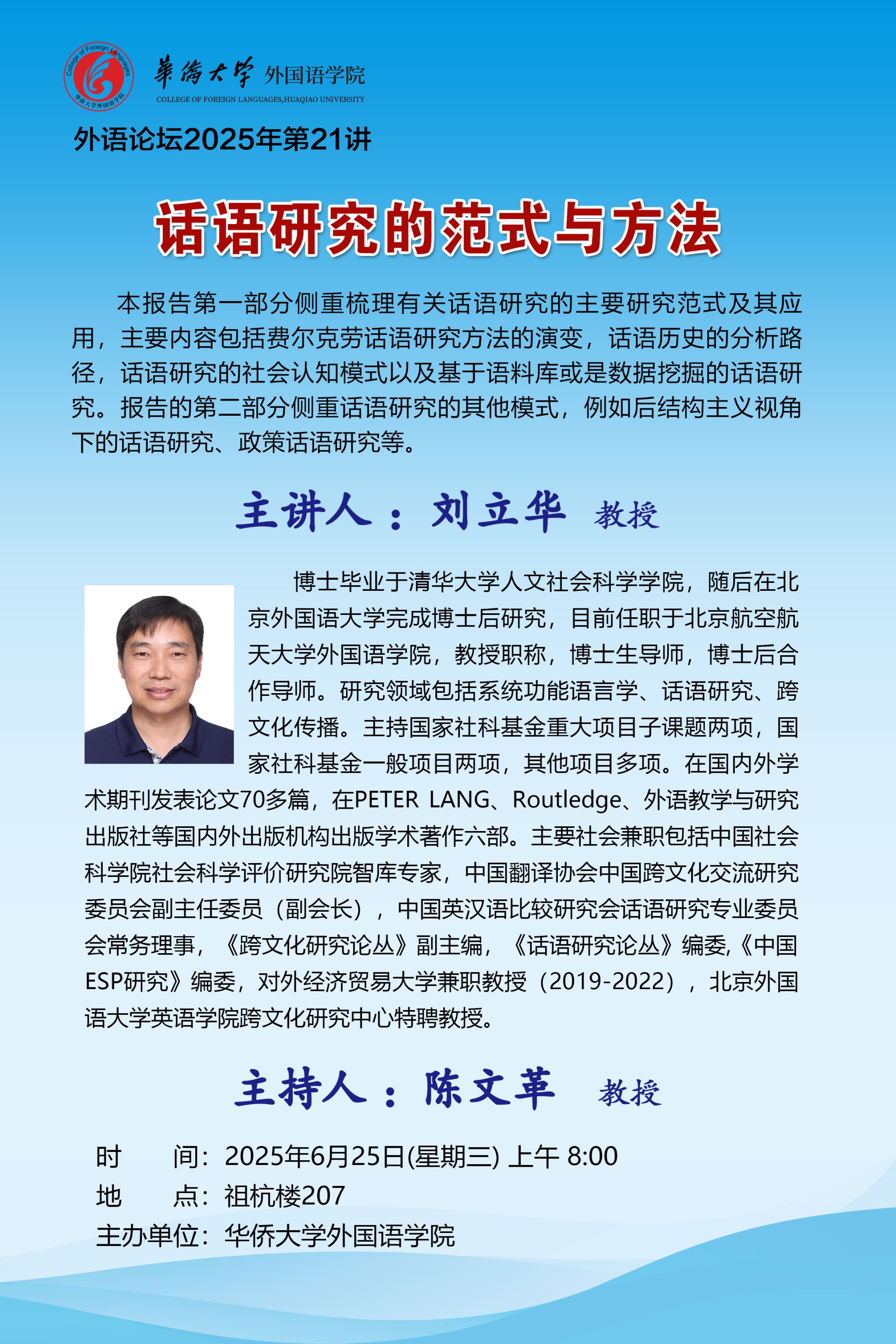 2025-07-022025年6月25日上午,北京航空航天大学云顶国际8588yd刘立华教授应邀为公司做学术讲座,主题为“话语研究的范式与方法”。讲座线上线下同时进行,由云顶国际8588yd陈文革教授主持,现场气氛热烈,互动频繁。讲座开始,刘教授阐明了“话语”和“语篇”的区别,并强调在学术讨论中,概念的定义必须明确来源,界定方式会影响研究中使用的分析框架与视角。接着,教授指出语篇分析必须与语境紧密结合,话语与语境之间存在辩证关系,互相作用与影响。...
