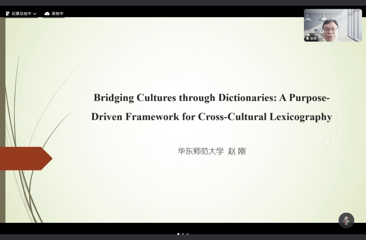 2025年7月8日上午,外语论坛2025年第23讲成功举办。云顶国际8588yd赵刚教授应邀开展题为“辞书作为文化传播的桥梁:构建目的驱动的跨文化词典学”的精彩学术讲座。本次讲座采用线上和线下结合形式,由陈文革教授主持,陈教授开场中简要介绍了赵教授的研究方向、代表性著作与学术贡献,特别强调其在推动中国文化“走出去”进程中的引领作用。