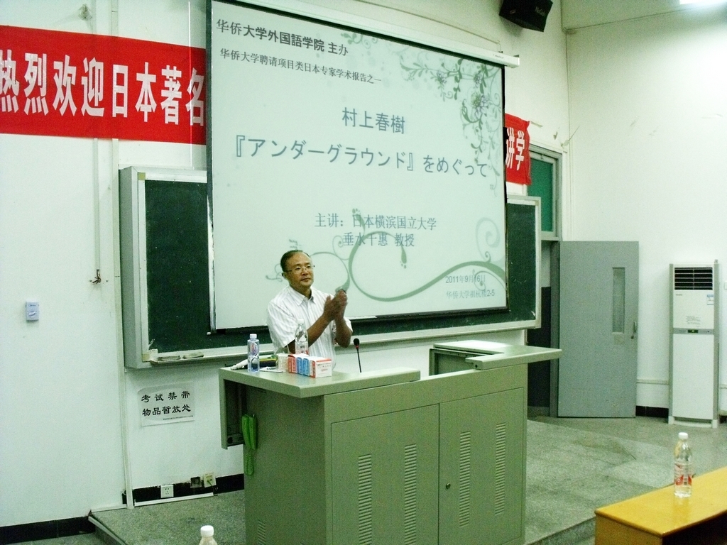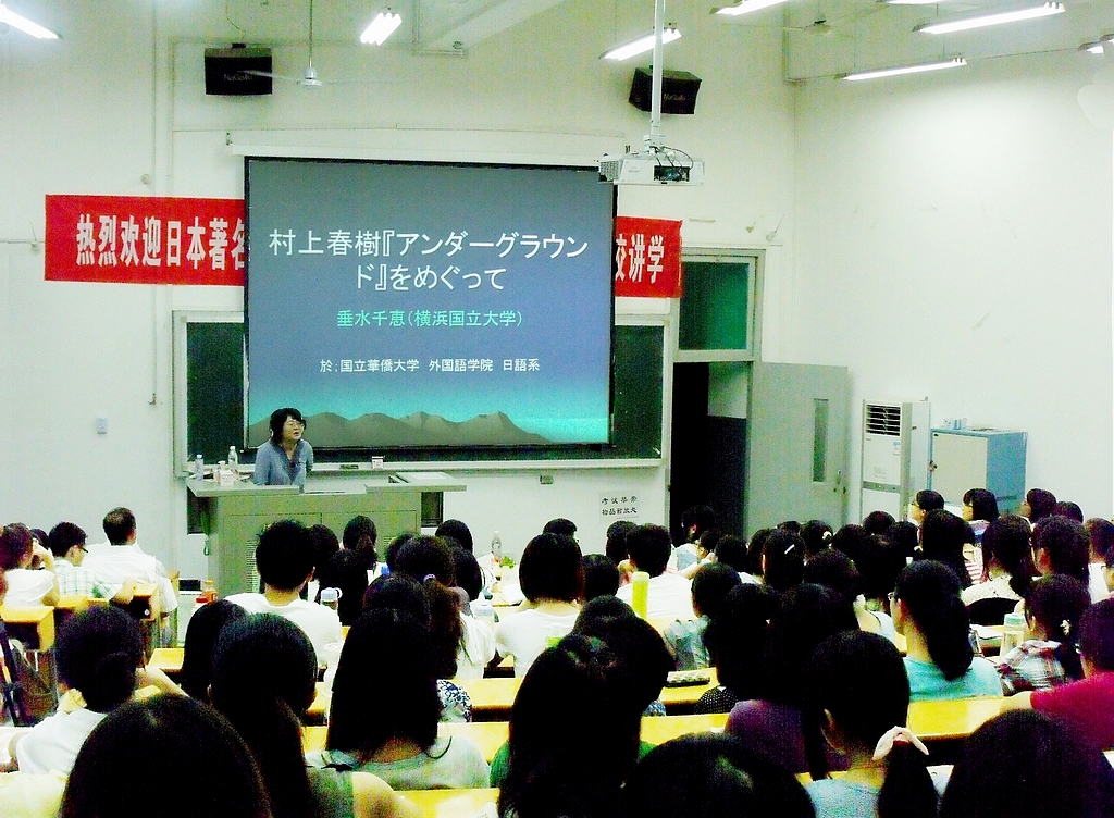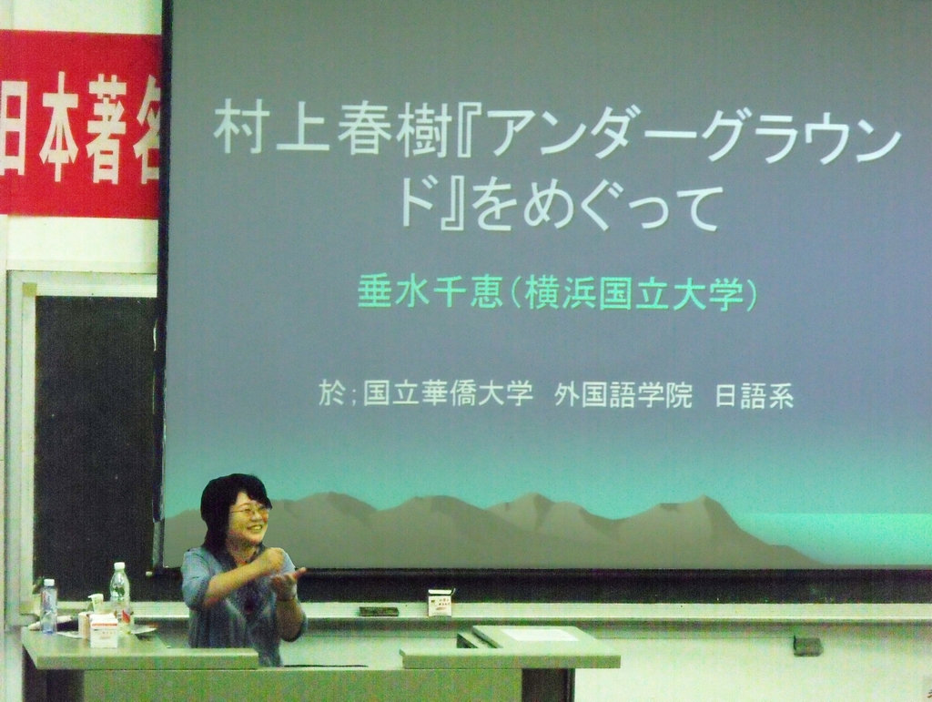 9月16日晚,垂水千惠教授以《村上春树与〈地下〉》为题,为师生作了学术报告。她详细介绍了村上春树及其长篇纪实作品《地下》,垂水教授就1995年3月20日晨发生于日本东京的地铁沙林毒气事件进行了阐述,为提高日语专业员工对历史事件的思考提供了一个独特的视角。并就中国员工最感兴趣的电影化作品——《挪威的森林》等,进行了生动活泼的交流。垂水教授始终亲切、优雅,为我们展示了日本女学者的知性和谦逊。