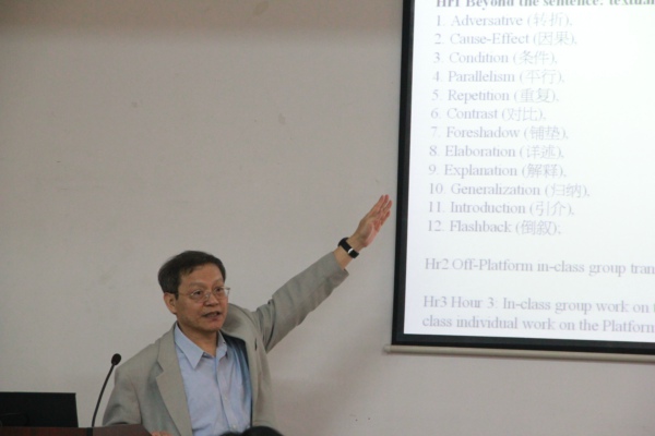 然后,朱纯深教授以幽默话语讲解了如何利用在线翻译平台设计一门英汉翻译课程,并列举许多生动实例说明利用平台进行翻译教学的益处,演示他在教学中实际进行的、如何将在线翻译语料库平台与教师自身拥有的资源有机结合起来进行翻译课堂教学的情景。朱教授特别强调,这样的翻译教学模式不会使师生受缚于平台,教师在利用该平台时可以充分发挥自身的主观能动性,师生通过借助平台可以进行大量的互动,员工由此可以提高独立思考的能力。