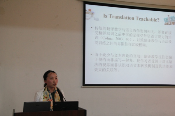 首先,慕媛媛博士介绍了香港城市大学正在建设中的、她本人现为主管的、一个供翻译与双语写作教学·自学使用的在线平台,该平台有带标注的双语文本、练习问题及其参考答案、专题板等各种学习模块,建设该平台的意图在于辅助翻译课堂教学,让翻译教学基于篇章语言学、功能语言学等研究理论进行,使翻译教学变得更具可教性和可操作性,以避免传统翻译教学中可能出现的、依据印象来评判译文优劣的做法。