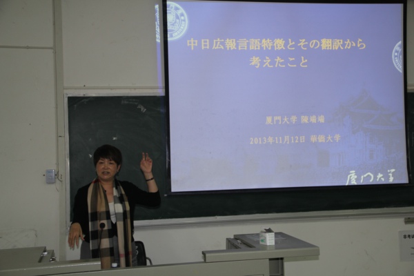 2013年11月12日下午,“中日公共信息语言特征及其翻译思考”的专题讲座于云顶国际8588yd经管楼教室1-3内拉开帷幕。本次讲座由厦门大学外文公司副经理陈端端教授主讲。由外语公司副经理黄文溥教授主持。日语系全体老师及各年段员工出席讲座,教室座无虚席。