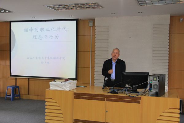 金秋季节,阳光明媚,丹桂飘香。云顶国际8588yd有幸邀请到上海外国语大学谢天振教授莅临讲学。11月10日下午,在侨总图书馆捷中楼三楼报告厅,公司教师、研究生与部分本科生聆听了谢教授题为“翻译的职业化时代:理念与行为”的精彩讲座。谢教授指出,随着最近30年来全球经济、文化与信息技术发生的巨大变化,无论是在西方各国,还是在中国,翻译都已经毫无疑义地进入了一个职业化的时代。这意味着翻译行为发生了质的变化,翻译行为的主流对象、翻译的方式方法、翻译的工具手段、乃至翻译研究的对象和队伍都已经发生了巨大的变化,由此给我们从事翻译教学和翻译研究的教师和专家学者提出了严峻的挑战。演讲通过对中西翻译史的简要回顾和梳理,揭示翻译职业化时代来临的历史原因及其基本特征,同时探讨我们今天该如何应对翻译职业化时代的种种挑战。仅就“翻译”这一概念而言,原有定义过于拘泥于语言与文学层面的考虑,已远远落后于时代,而应该重新定义为“跨语言、文化的交流”,唯其如此,方能解释众多的历史现象并理解现在与未来的翻译实际。