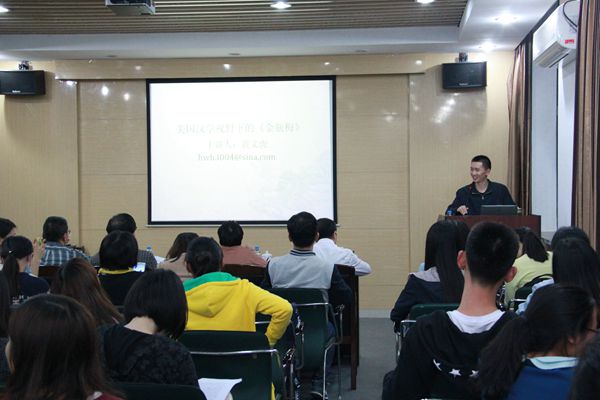 提问环节之后,黄文虎博士为大家做题为“美国汉学视野下的《金瓶梅》”的学术报告。《金瓶梅》是一部极具争议的中国古典小说,此前大家对它可谓讳莫如深。黄文虎博士以丰富的史料介绍了《金瓶梅》在国外的译介和传播情况,他着重从儒家视角、人性视角、女性主义视角和商业视角等角度梳理了中西学者对《金瓶梅》尤其是书中主要人物形象的不同看法。黄博士的讲座内容丰富、语言风趣幽默、视角新颖、资料详实,讲座的过程中频频获得听众的掌声。而嘉宾点评和听众提问的互动环节也同样精彩,师生们和黄博士就《金瓶梅》在汉学研究中的具体问题进行交流,现场的学术讨论氛围十分浓郁。