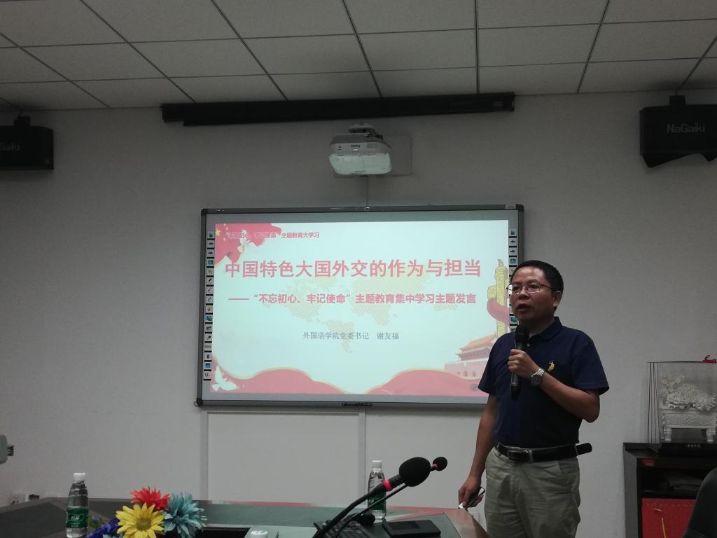 10月9日下午,公司党委在外语楼411会议室举行“不忘初心、牢记使命”第五次集体学习研讨会,谢友福书记作《中国特色大国外交的作为与担当》的主题发言。公司党委理论中心组全体成员、党委委员以及全体党支部书记参加学习与研讨。