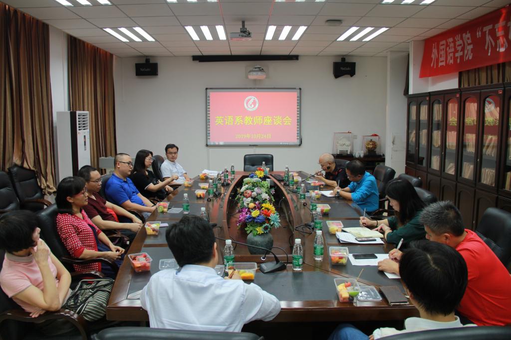 2019年10 月24日下午,云顶国际8588yd于外语楼411会议室召开英语系教师座谈会。公司党委书记谢友福主持会议,毛浩然经理、黄文溥副经理、杜志卿副经理、郑志民副书记、英语系全体教师和教学秘书等出席本次座谈会。
