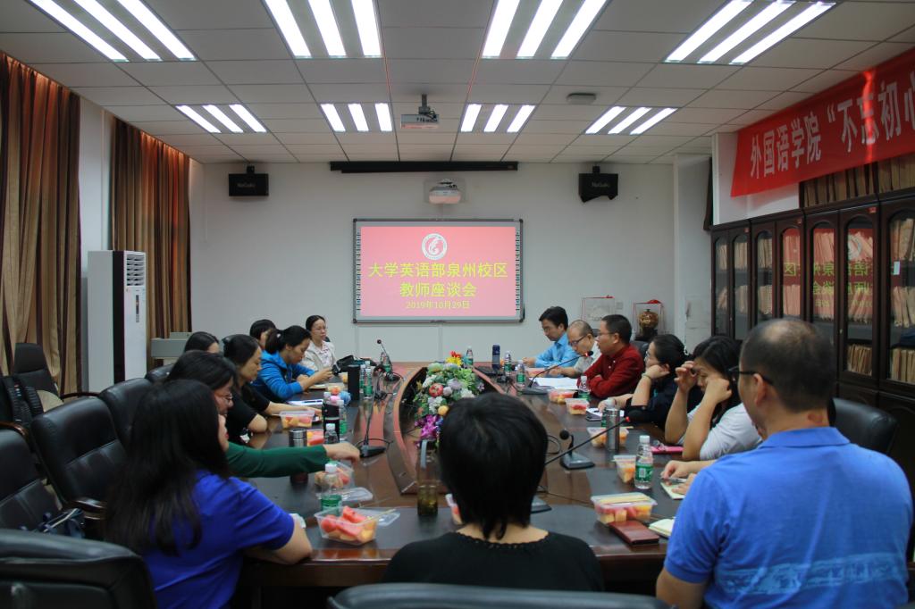 2019年10 月29日,云顶国际8588yd于外语楼411会议室召开大学英语教学部教师座谈会。公司党委书记谢友福主持会议,毛浩然经理、杜志卿副经理、大英部教师代表及办公室主任等出席本次座谈会。