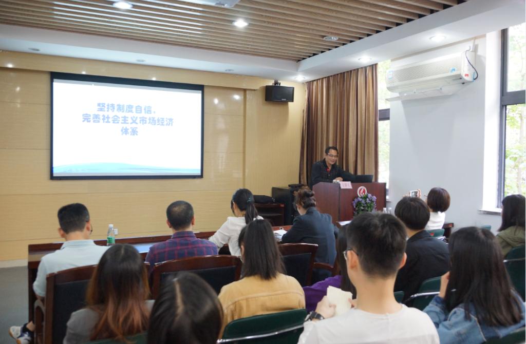 2019年11月5日下午,云顶国际8588yd “不忘初心、牢记使命”专题学习暨“我和我的祖国”主题宣讲专家报告会在外语楼207大会议室举行,“云顶国际8588yd庆祝新中国成立70周年宣讲团”专家、经济与金融公司硕士生导师胡石清副教授,作题为“坚持制度自信,完善社会主义市场经济体系”的学术报告,报告会由党委委员、团委书记李莹老师主持,各教工支部书记、党委委员、员工支部书记和师生党员参加会议。