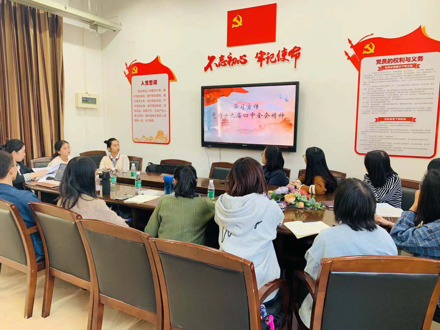 首先,吴倩倩老师带领与会党员集中学习了习近平总书记在党的十九届四中全会上的报告和决议主要内容,突出强调在中国特色社会主义事业进入新时代,在庆祝中华人民共和国成立70周年之际,党的十九届四中全会的召开具有重大历史意义和深远战略意义。尤其是共青团作为党的助手和后备军,作为党联系广大青年的桥梁和纽带,必须认真学习、广泛宣传、坚决贯彻全会精神。这一点更加要求我们老员工要进一步增强“四个意识”,积极学习,努力工作,自觉践行社会主义核心价值观,老员工党员要充分发挥党员先锋模范作用,做好学习和宣讲。随后吴倩倩老师针对本次四中全会精神学习的文件,对员工支部的学习要求做了说明,并强调各员工支部务必端正学习态度,强化学习效果,扩大学习范围,结合“三会一课”做好宣讲。