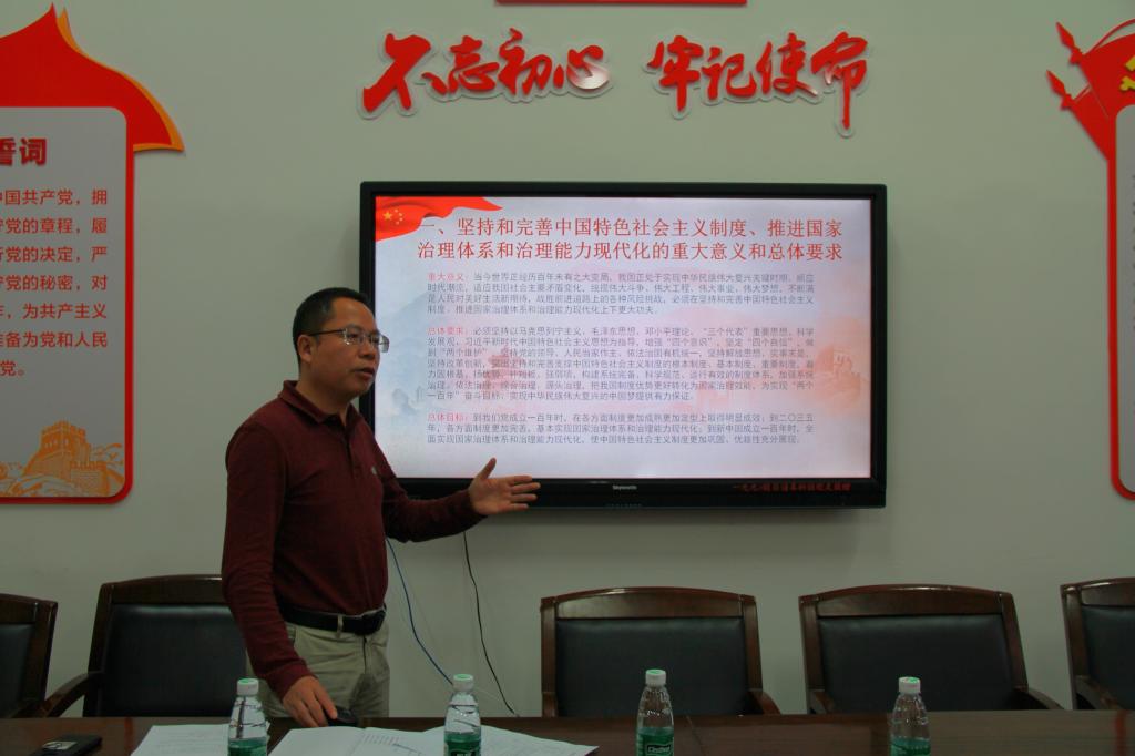 会上,谢友福书记重点解读了《中共中央关于坚持和完善中国特色社会主义制度、推进国家治理体系和治理能力现代化若干重大问题的决定》的主要精神和具体内容,他强调四中全会是我们党站在“两个一百年”奋斗目标历史交汇点上召开的一次十分重要的会议,是在新中国成立70周年之际、我国处于中华民族伟大复兴关键时期召开的一次具有开创性、里程碑意义的会议,具有十分重要的意义。要结合“不忘初心、牢记使命”主题教育,通过干部教育、党校培训、教职工政治理论学习、员工思想政治教育、支部组织生活,结合实际开展学习活动,帮助广大党员干部和师生及时准确掌握全会精神的基本内容。要把四中全会精神列入思想政治理论课教学内容,思政课程与课程思政要积极跟进,推动全会精神进教材、进课堂、进头脑。