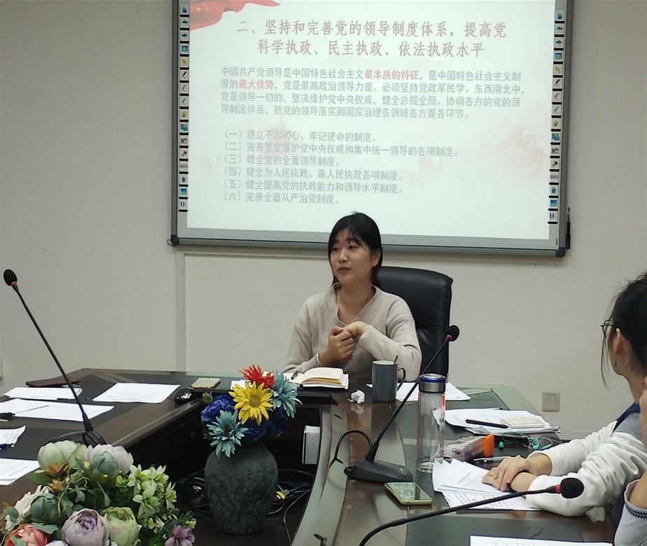 在共同学习完成后,党员同志们积极发表了自己的看法,讲述了本次学习会议的收获。大家都表示通过此次学习,进一步了解了十九届四中全会精神,同时,大家也表示从十九届四中全会中,可以看到,在党的领导下,我们国家正在快速发展。紧接着,老师总结此次会议学习内容,并倡导大家进一步关注时事,将党的会议精神与实际生活联系起来,将学习的精神内化于心,外化于行,在生活中进一步学习贯彻十九届四中全会精神。
