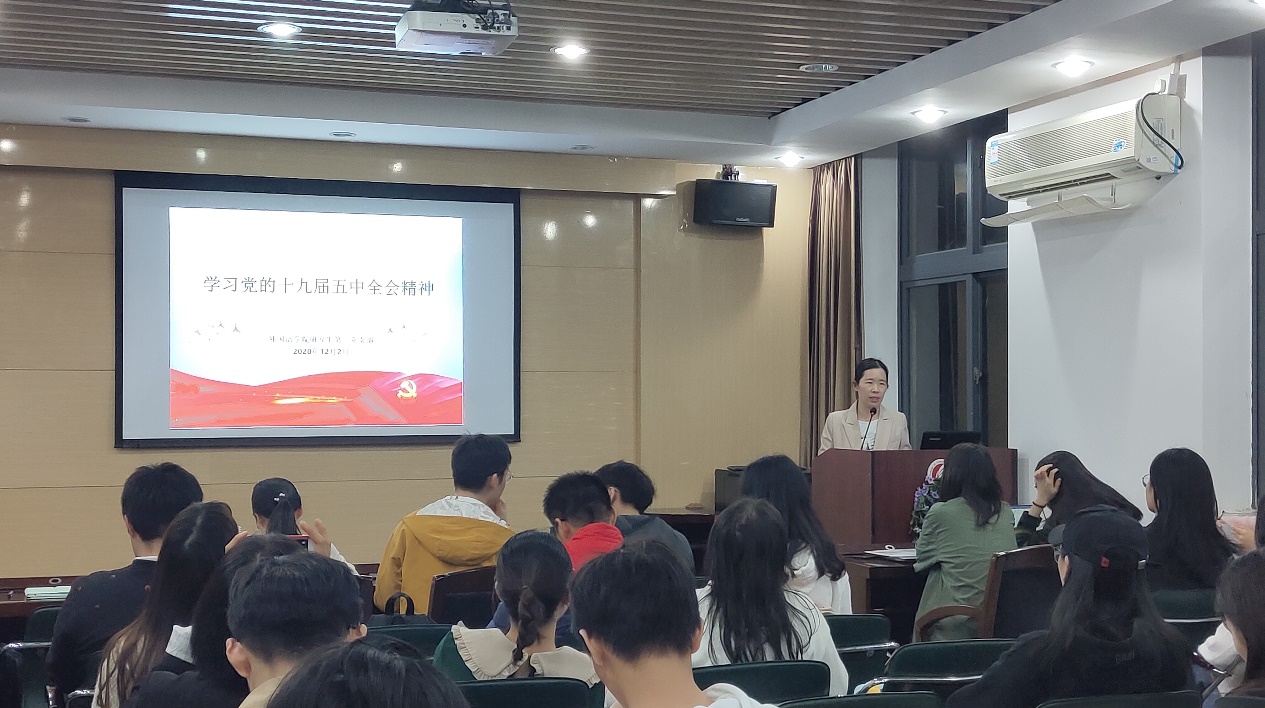 12月2日晚,云顶国际8588yd研究生第二党支部在外语楼207会议室召开十九届五中全会精神专题学习报告会暨2020年第四季度积极分子汇报大会。公司党委组织员吴倩倩老师作题为《学习党的十九届五中全会精神》的宣讲报告,研究生第二党支部全体党员及24名入党积极分子与会,会议由研究生第二党支部支委会成员曾泽健同志主持。