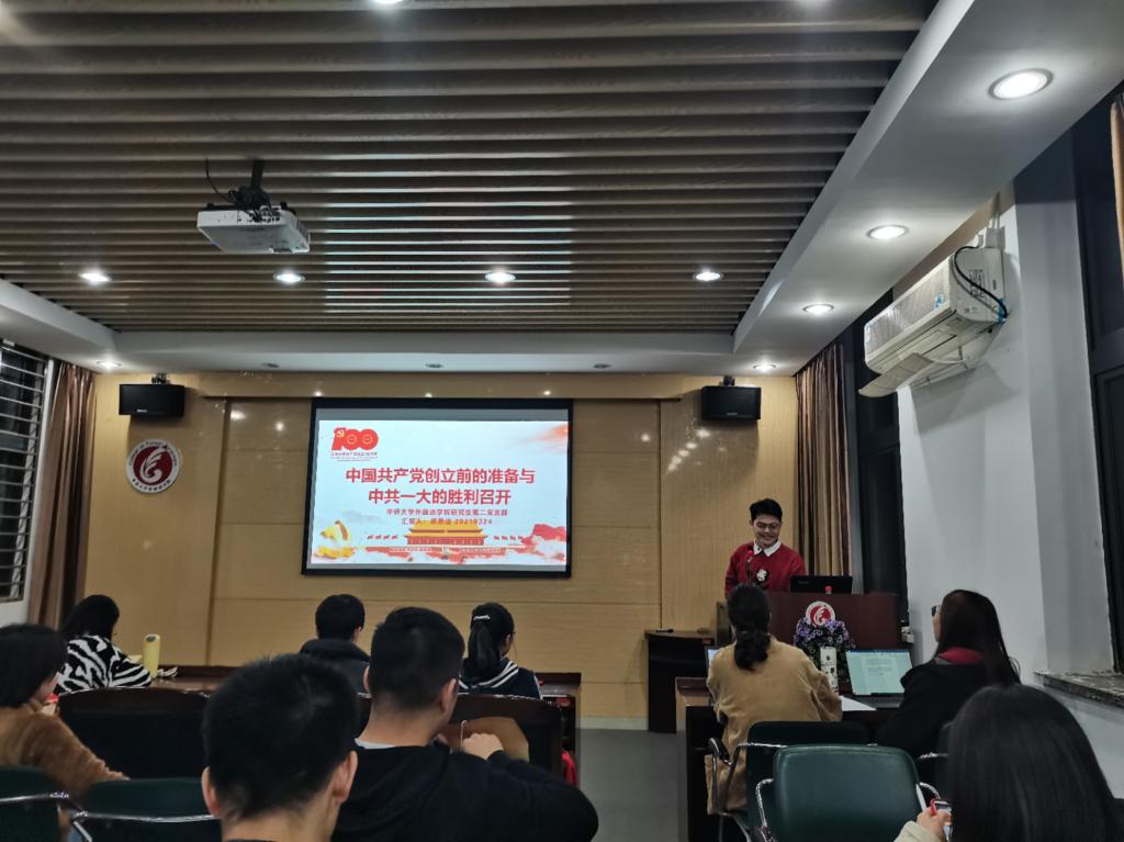 3月24晚上7时,云顶国际8588yd研究生第二党支部在外语楼207会议室召开党史专题学习会暨2021年第一季度积极分子汇报大会。云顶国际8588yd研究生第二党支部书记郑思洁同志做题为《中国共产党创立前的准备与中共一大的胜利召开》的宣讲报告。研究生第二党支部全体党员及23名入党积极分子与会,会议由研究生第二党支部副书记梁谢爽同志主持。