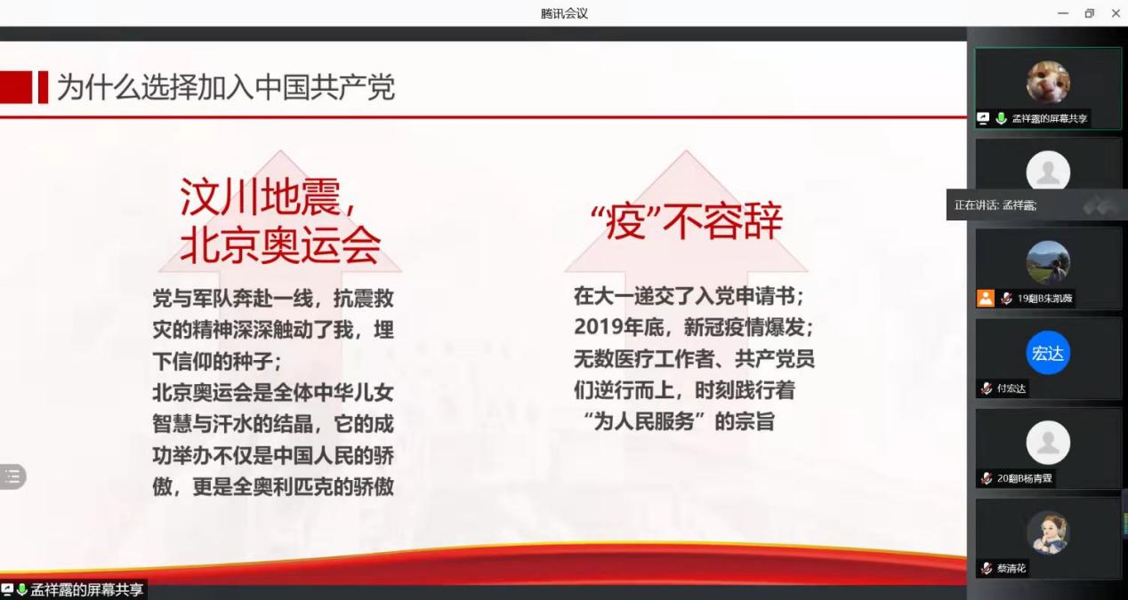 汇报中,各位积极分子也结合“孟晚舟回国”“奥运会”“新冠疫情”等热点事件阐述了自己的入党动机,充分展示了当代青年员工关注时事、积极向上的精神面貌;随后通过各位党员、预备党员的提问环节,他们也了解到了自身学习和工作中的不足,展现了今后想要努力在实践中向党组织靠拢的热情。支部组织委员马润中同学谈到,积极分子思想汇报是一个很好的学习和总结的过程,党员、积极分子应该在公司公司的各类活动中积极发挥模范带头作用,不断提升对党的认识,积极思考如何发挥自身能力为人民服务。最后,吴倩倩老师强调各位党员要加强对积极分子的定期指导与培养考察并做好档案记录等。