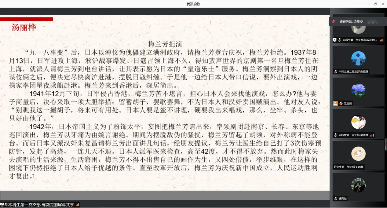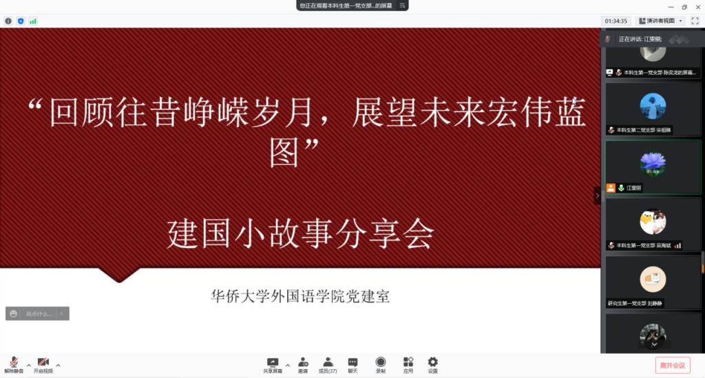 各支部的青年党员以昂扬的精神状态、饱含深情的演绎为大家分享建党一百周年以来的感人故事。内容从建国前的坎坷之路,到建国后的开拓之路,从改革开放后的腾飞之路,到社会主义新时期的辉煌之路。与会人员纷纷感慨,中国共产党的一百年,是矢志不渝初心如磐的一百年,是筚路蓝缕奠基立业的一百年,是创造辉煌开辟未来的一百年。丰富的建国故事、多样的主题选材、多角度分析让这次的建国故事分享会充满了不一样的温暖,党员们再次感受到了革命者们甘于奉献的红色精神。此次线上活动意在以这种别出心裁的视角和方式带领大家穿越历史长河,感悟时代精神,激发大家心中的爱国情怀。