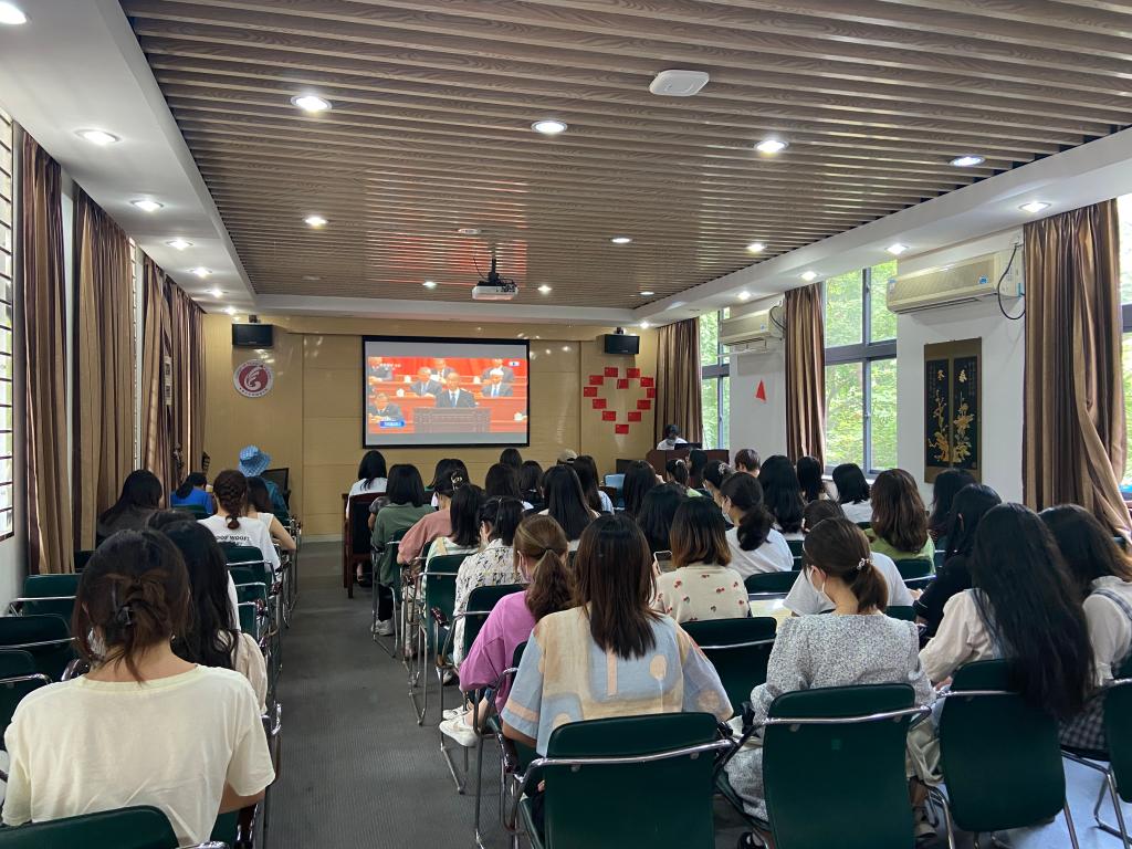 观看直播过程中,在场的各位师生党员、预备党员认真观看并参与了讨论,当国歌响起时,各位党员、预备党员们保持安静,仿佛自己也置于会场之中。听总书记字字铿锵、掷地有声的话语时,现场掌声不断,党员们感到备受鼓舞,爱国热情也得到了进一步的激发。