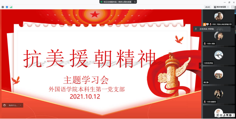 为纪念中国人民志愿军抗美援朝出国作战71周年,缅怀71年前为保卫国家而浴血奋战的革命烈士,云顶国际8588yd本科生第一党支部于2021年10月12日下午在线上开展“抗美援朝精神”学习会,鼓励党员们向先辈们学习,为实现中华民族伟大复兴贡献自己的一份力。出席此次会议的有云顶国际8588yd本科生第一党支部书记黄洁萍老师,及其支部全体党员和预备党员。学习会以近期热映中的电影《长津湖》为切入点,为大家具体介绍了抗美援朝战争中的长津湖战役,全体党员及预备党员一起学习伟大的抗美援朝精神。
