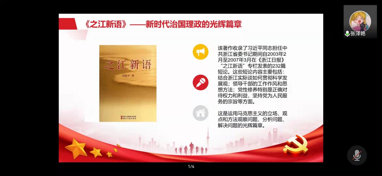 本次分享会共有三个小组进行分享,分享了《之江新语》《摆脱贫困》《习近平在福建》等党史书籍。分享期间,同学们聚精会神,认真观看。分享会结束后,同学们展开了交流与讨论,其中多位同学发表了自己的感想:2019级党雪晗:读《之江新语》一书,汇集了习近平同志在担任浙江省委书记期间,于《浙江日报》“之江新语”专栏发表的232篇短论。这些短论通俗易懂、娓娓道来,其中蕴涵的思想精华与新一届中央领导集体的执政方略和习近平同志担任总书记以来的系列重要讲话精神高度契合,是运用马克思主义立场观点方法观察问题、分析问题、解决问题的光辉篇章,是当代中国共产党人励精图治、造福人民的生动写照,是贯彻落实中央精神、紧密结合地方实际推进省域经济社会科学发展的重要遵循。