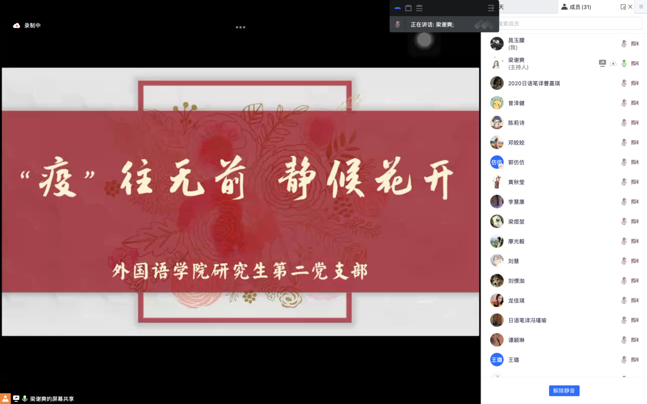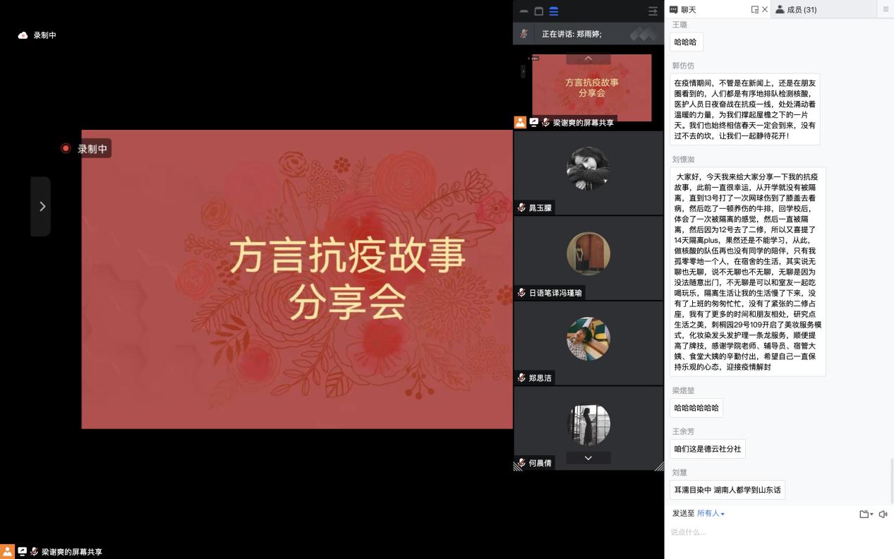 随后进入到方言防疫故事分享会环节。全体党员同志畅所欲言,纷纷用自己的家乡话讲述自己的经历与感受,来自山西忻州的梁煜堃同志用忻州话讲述了有趣的宿舍隔离生活,“有亲爱的舍友们的陪伴,我的宿舍隔离生活变得不再索然无味”;来自湖南衡阳的刘慧同志用衡阳话表示“我的隔离生活并不无聊,有趣的灵魂让平淡的日子熠熠生辉”;还有党员同志用电白话、客家话、江西话、广州话等向所有奋斗在一线的抗疫工作人员表达敬意,“我们不害怕,因为有人在替我们负重前行”“虽然疫情阻挡了人们奔向春天的脚步,却别有一番春天的温暖让人动容”······