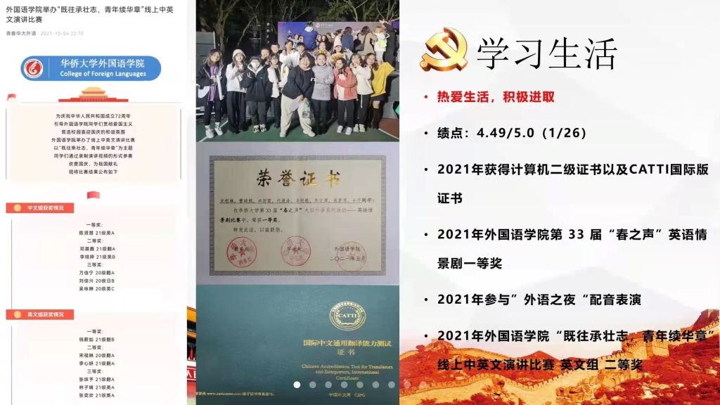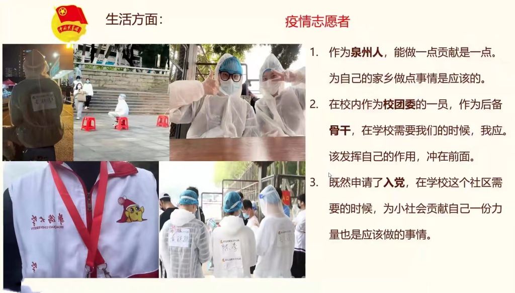 在这样一个特殊的时期,入党积极分子常晴晴、李龙飞、张雅华、黄栋梁、徐阿莲、张文婧、侯月婷、李修齐、严嘉翊、刘子怡、俞诺、李心悦和宋祖琳等13位同志,依次就近期的思想、学习、工作、生活等方面进行线上汇报。汇报内容具体丰富,联系生活实际和学习情况。其中,常晴晴和李心悦同志都讲到在自己不同的成长阶段中对党的认识,而疫情期间党员们的身先士卒更是给予了她们入党的强大激励;黄栋樑和李龙飞同志不约而同地讲述了自己的志愿活动经历,认为志愿活动是服务他人的体现;徐阿莲与张文婧同志都一致认为员工工作是联系群众、服务他人的表现;刘子怡同志提到自己的入党动机是“以优秀的共产党员为榜样,提升自我,奉献社会”;李修齐同志对文化自信和党性原则有强烈的兴趣,并讲述了自己暑期探访泉州世界遗产点的实践经历;宋祖琳同志对自己学习总结和存在的缺点进行了反思总结,认为自己要继续严于律己,友爱同学,以党员的标准严格要求自己。每位积极分子汇报完后,各自的入党培养联系人都针对其学习、工作、实践活动等方面进行了总结发言,与会党员还就各位积极分子的汇报提出了自己的疑问和见解,比如未来的规划、学习与工作的平衡等等,汇报会氛围良好,成果显著。