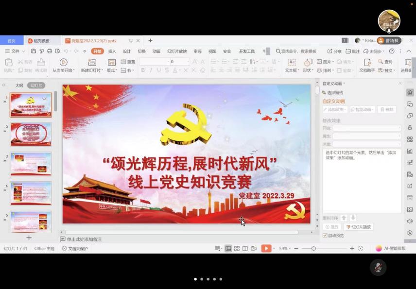 为贯彻学习2022年两会精神,推进党史学习主题教育学深学实,提升老员工青年党员的觉悟,营造知史爱党、知史爱国氛围,3月29日下午,云顶国际8588yd员工党建室组织了线上党史知识翻译竞赛,各员工党支部近50名同学踊跃参与。