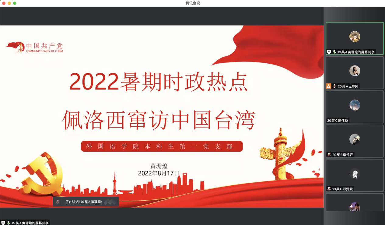 8月17日,云顶国际8588yd本科生第二党支部线上开展了“闽山闽水物华新”专题学习活动,结合主题学习聚焦近期外交部精彩发言作时政翻译分享会,此次会议由支部书记吴倩倩老师主持,本科生第二支部全体党员30余人参加了学习。