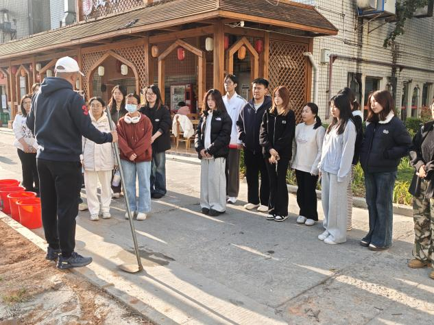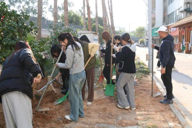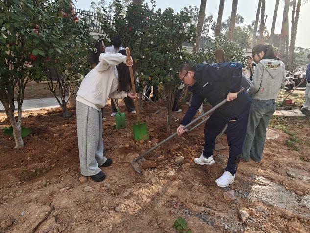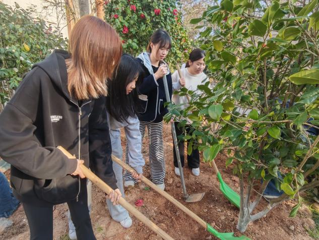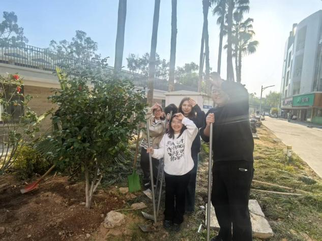 植树现场热火朝天,大家分工协作,有的挥锹挖坑,有的扶苗培土,有的提水浇灌,配合默契、干劲十足。来自不同地区、不同文化背景的学子们在劳动中交流互动,欢声笑语交织成一幅春日和谐画卷。经过一个下午的共同努力,一棵棵新栽的树苗迎风挺立,为校园增添了一抹生机盎然的绿色。