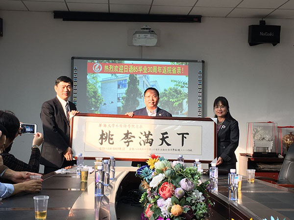 座谈会上,谢友福书记首先代表公司对日语专业85级员工们的到来表示热烈的欢迎,并向他们介绍了公司的发展状况和发展愿景,希望员工们常回家看看,多多关心支持公司的建设和发展。员工代表陈鹃对公司的热情接待表示衷心感谢,对公司的发展和进步表示由衷的高兴和自豪。王铁钧老师作为当年的班主任,深情回忆了与员工们度过的难忘岁月,殷切嘱咐员工们在为事业拼搏的同时,要倍加珍惜家庭和身体健康。时任外语系办公室主任洪玉兰老师也饱含深情地回味了与员工们共处的美好时光。在座员工们分别汇报了毕业后的职业发展情况,纷纷表达了对美好岁月的追忆和对公司的思念。接着,员工们向公司赠送了由潘桂芳员工亲笔书写的“桃李满天下”书法匾额,谢友福书记代表公司向员工们回赠了校徽纪念品。最后,员工们深情地朗诵了自编自创的《情系华园》诗歌,表达了对公司的无限眷恋和美好祝福。