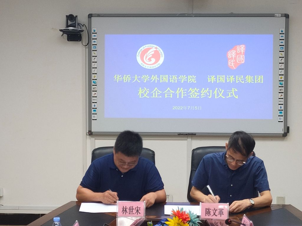 随后,译国译民集团院校合作经理陈建清详细介绍了该集团近年与国内上百所高校开展合作的项目情况。双方随之对校企合作的具体方向和细节进行了深入、细致的交流探讨。会上,举行了实习实践基地合作签约仪式,林董事长、陈副经理代表双方在合作协议上签字。