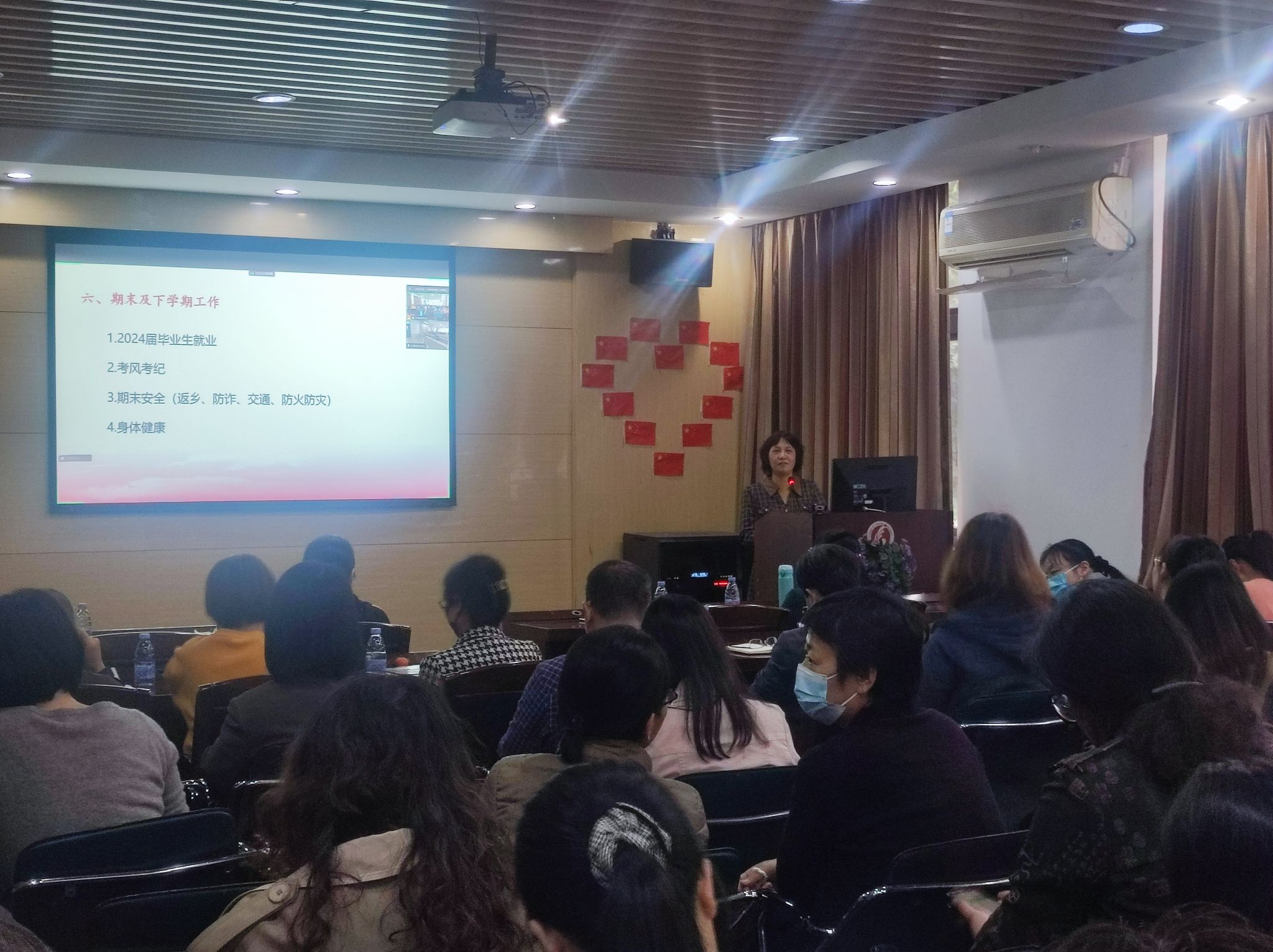 李璐岚主要对本学期公司党委工作、工会工作和员工工作进行总结,组织全院教职工专题学习师德师风建设、《云顶国际8588yd章程》和党风廉政建设与网络文明,并对全院教职工进行期末安全主题教育。回顾了本学期公司各党支部活动开展、工会活动开展、成功举办三场教学学术会议、成功举办公司60周年院庆、协助做好本科审核评估等工作。还就期末、假期和下学期工作等进行部署,并请大家提高安全防范意识,确保人身和财产安全,共度快乐寒假。